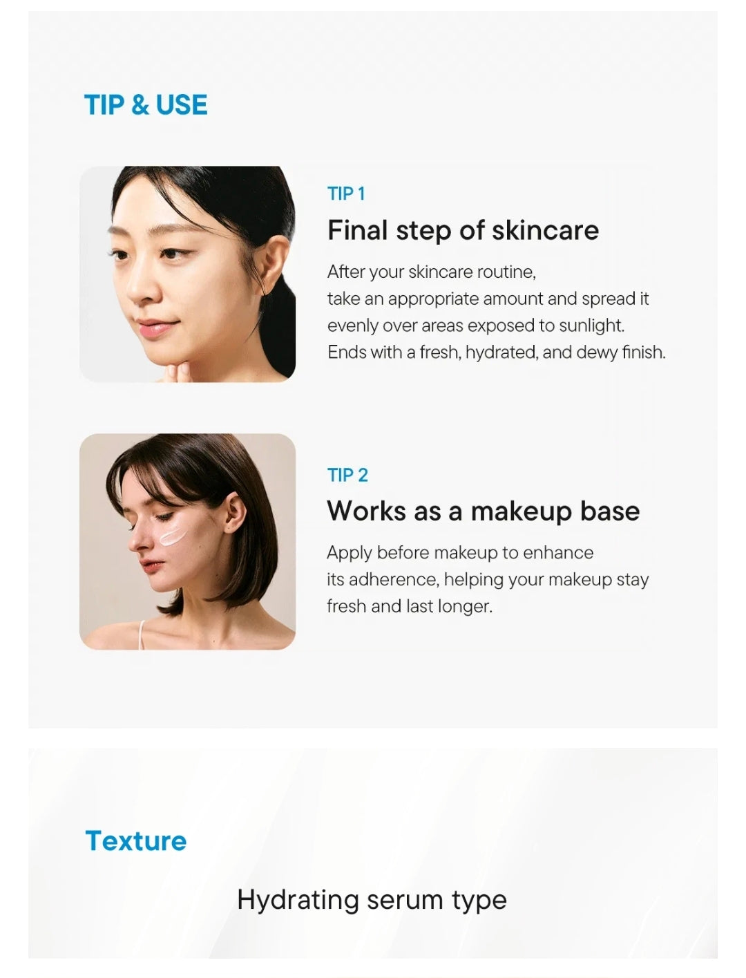 - Features a triple-layer oil-in-gel-in-water structure that provides a serum-like light texture and offers a white cast-free finish for all skin types.