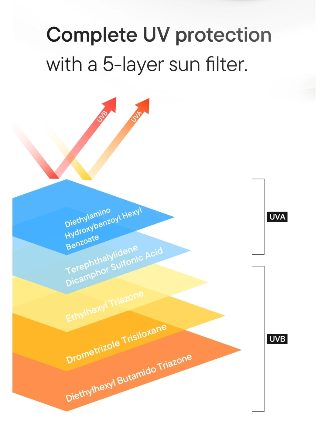 - A chemical sunscreen formulated with a 5-layer sun filter that offers comprehensive UVA and UVB blocking with broad spectrum SPF 50+ PA++++.